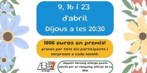 Torneig de Primavera Inici: dijous 9 d’abril a les 20:30 Dates: 9, 16 i 30 d’abril 👉 1000 € en premis 👉 Puntuable per …
