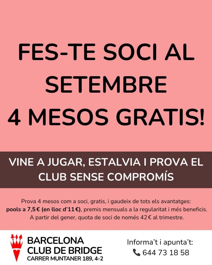 Al Barcelona Club de Bridge, si t’apuntes com a soci al setembre, tens 4 mesos de quota gratuïta (de setembre a desembre) per provar el club sense compromís.