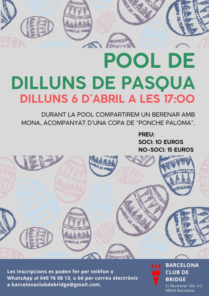 🐣 Dilluns 6 d’abril – Pool de Pasqua A les 17:00 celebrarem la tradicional pool de la Mona. Durant la sessió compartirem un berenar amb mona i una copa de “Ponche Paloma”. 👉 Preu: 10 € socis / 15 € no socis